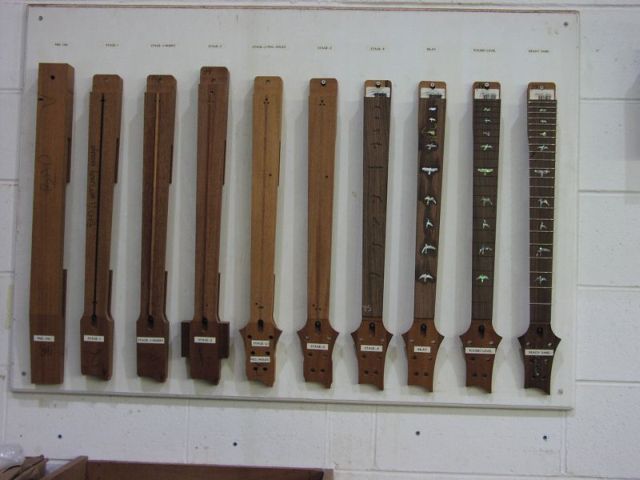 The multi-stepped process for making the neck, including the standard inlay.
